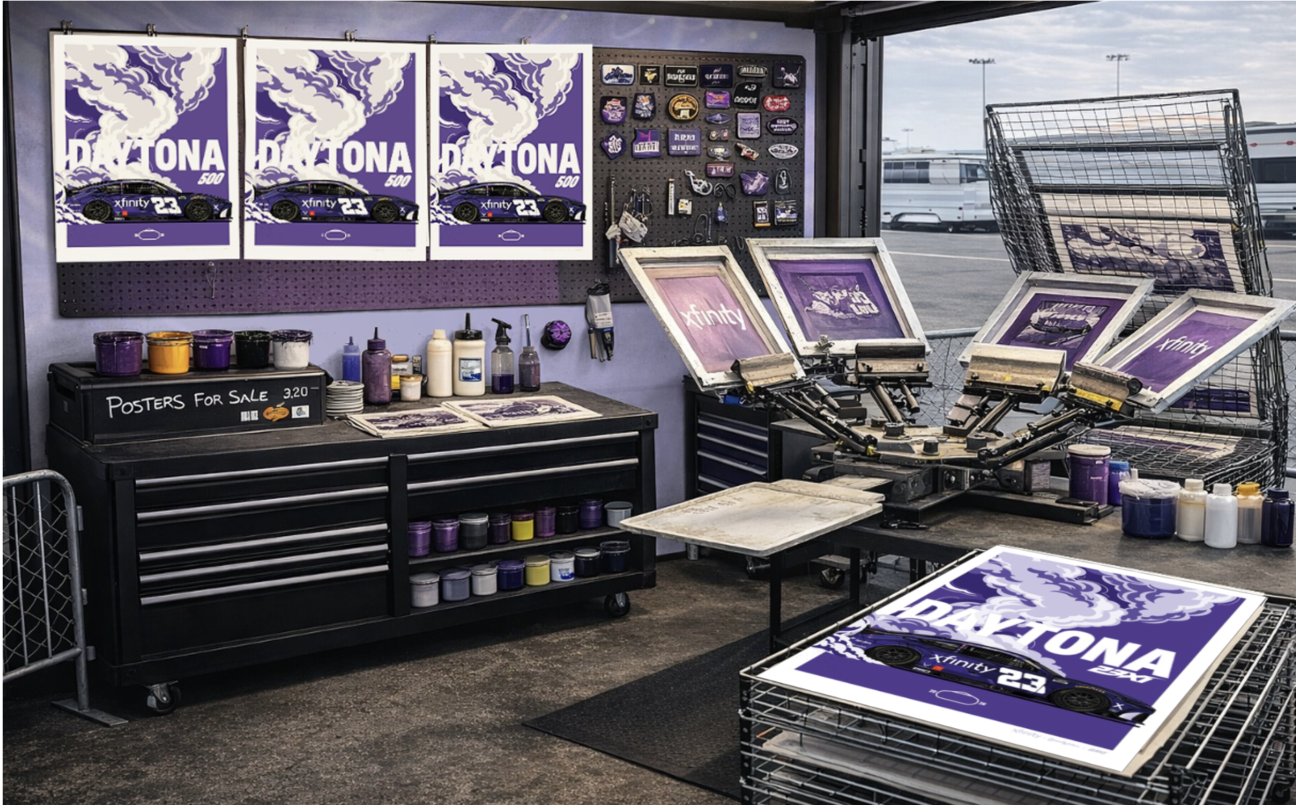 The experience is rooted in craftsmanship and precision. Each print is produced on site using traditional silkscreen methods, transforming race-day graphics into collectible artifacts fans can own.